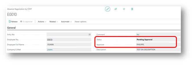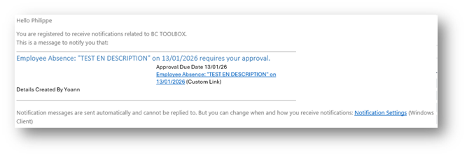 An email, from Business Central (approval workflow), has been sent to the approver defined in the line above: