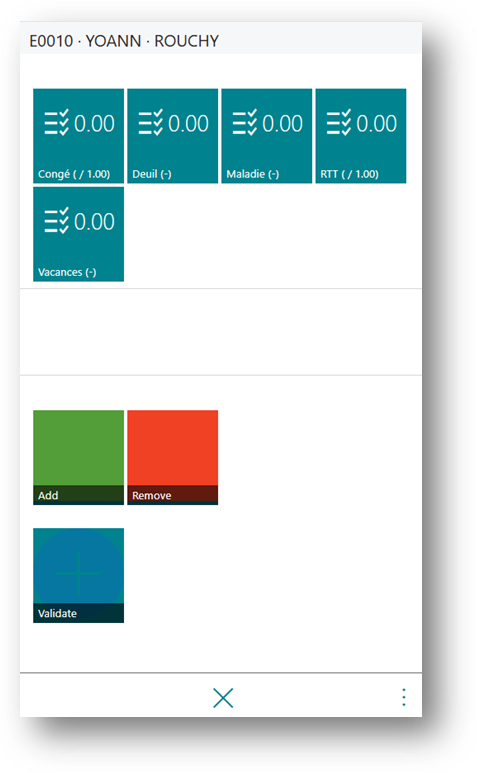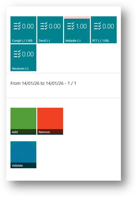Choose a type of absence (Leave / Sick / RTT) then click on "Add" or "Remove" to define the desired quantity.